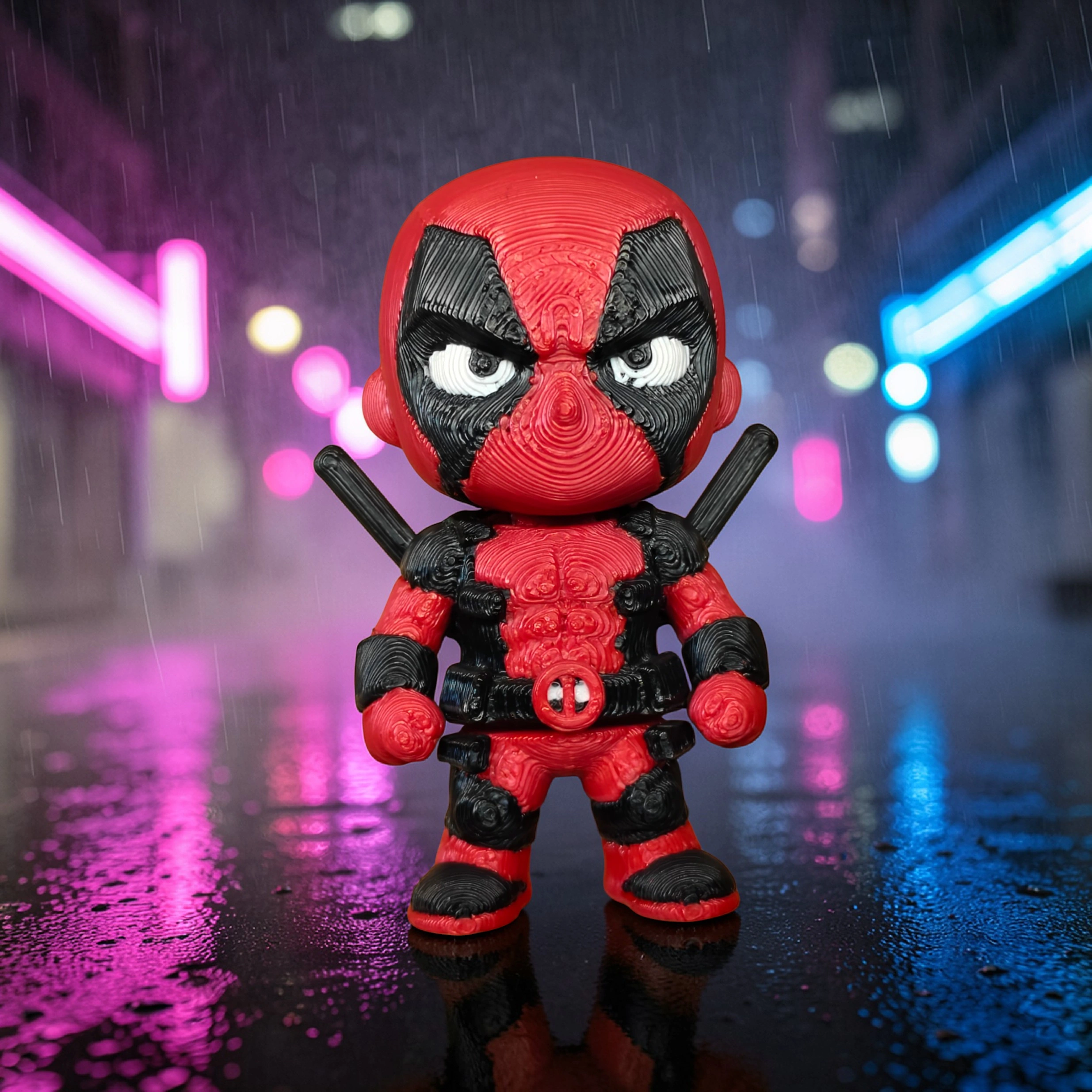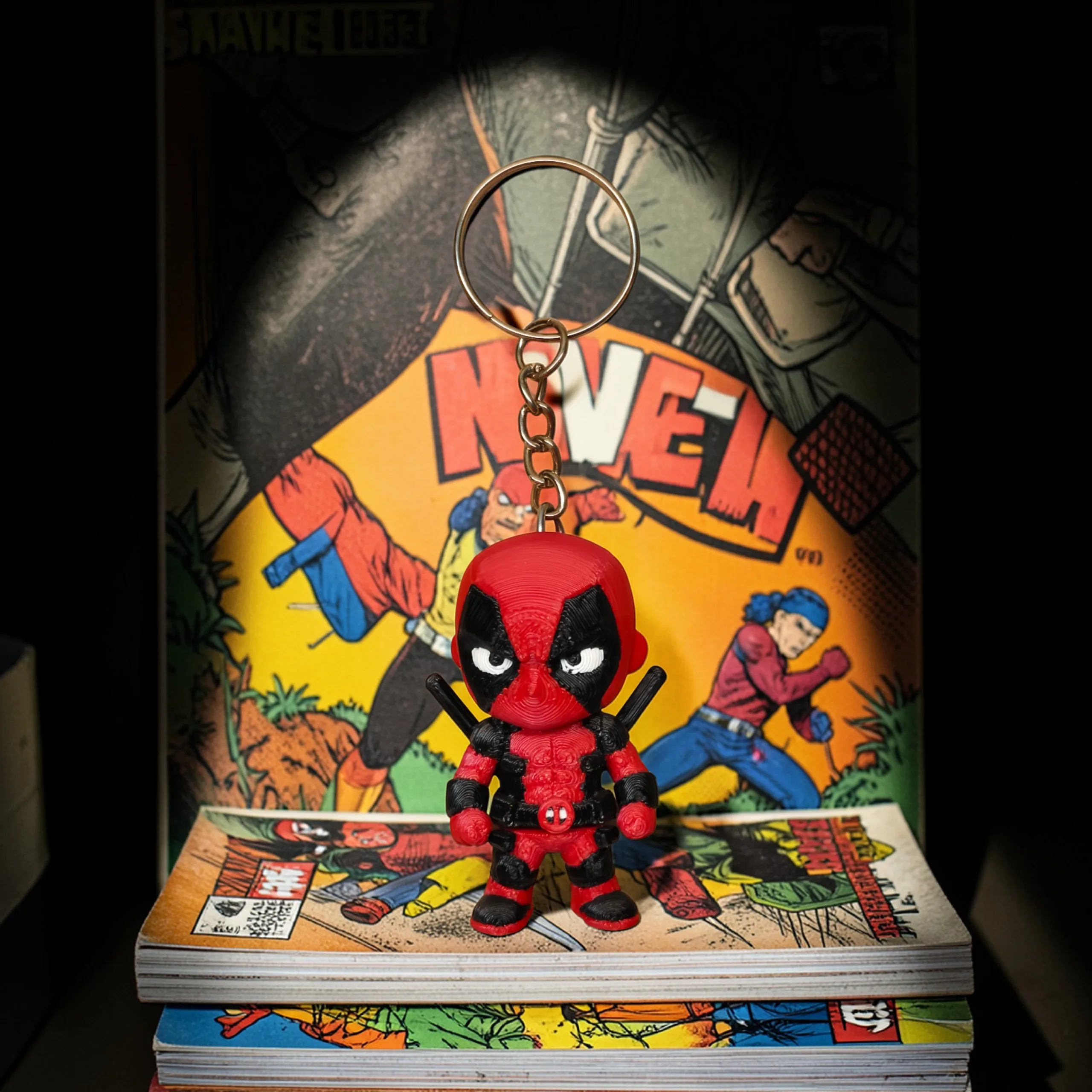 Flexible 3D printed keychain inspired by Deadpool with movable parts for added fun.