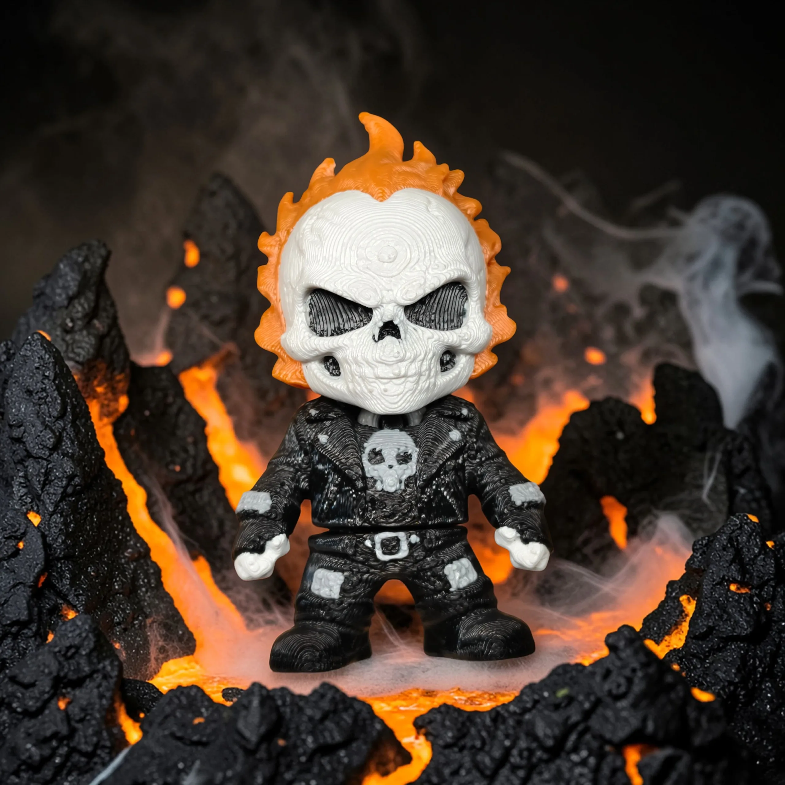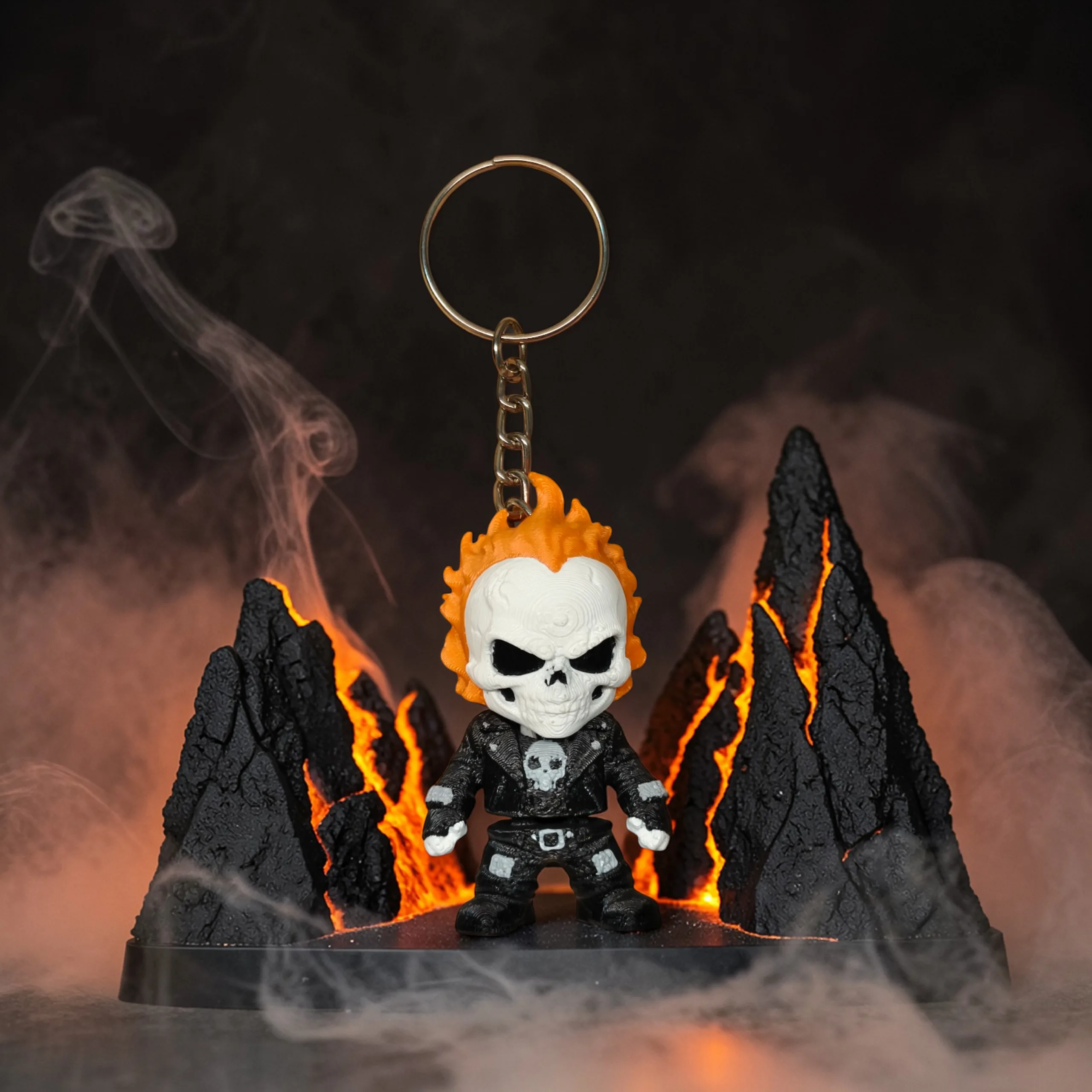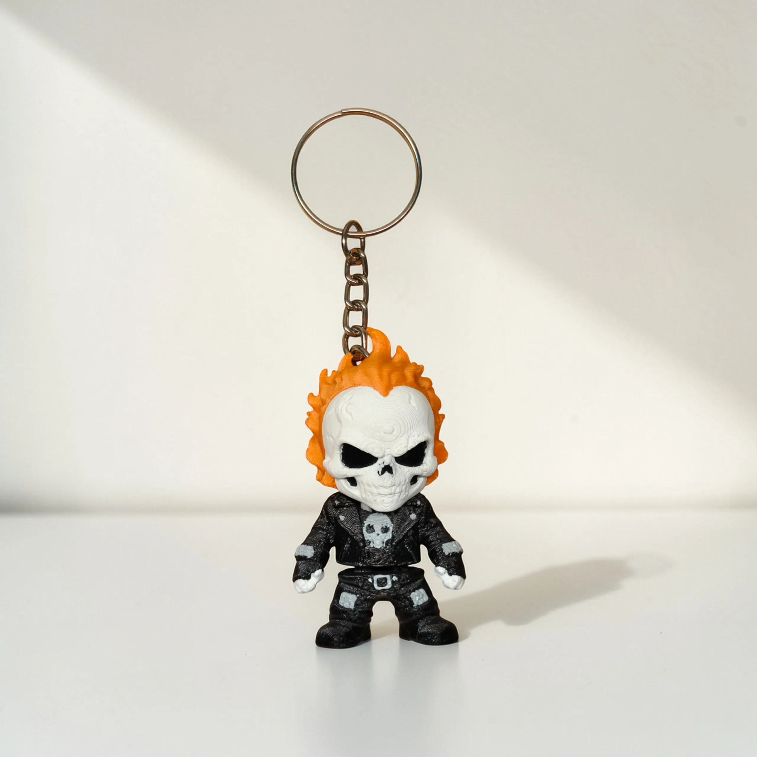 3D printed flexi keychain inspired by Ghost Rider, featuring his iconic flaming skull design.